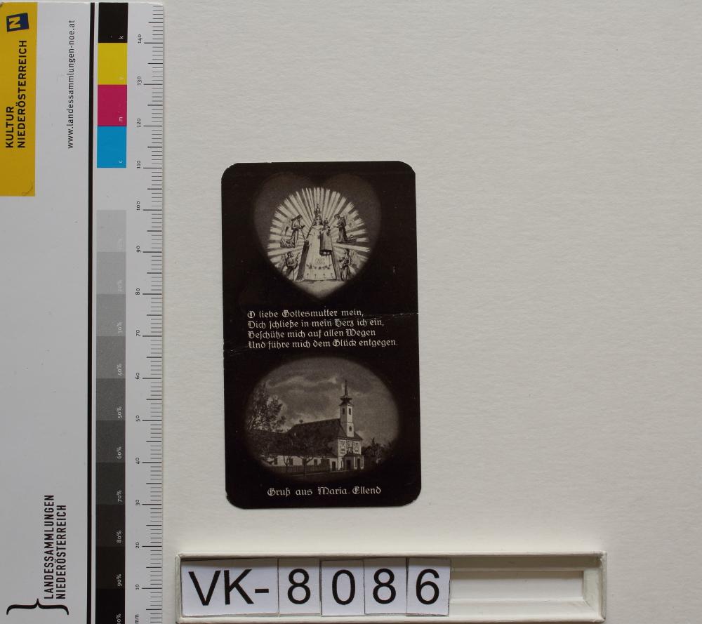 Haslau - Maria Ellend, "Maria an der Straße"; Vorderseite: Gnadenstatue = Maria mit Kind, Wallfahrtskirche, Engel, "O liebe Gottesmutter mein, Dich schließe in mein Herz ich ein, Beschütze mich auf allen Wegen und führe mich dem Glück entgegen", "Gruß aus Maria Ellend"; Rückseite: "Trost im Gebet", "2105/ Peter Wien"; Eintrag Inventarbuch: Gebetszettel, Slg. Klar.