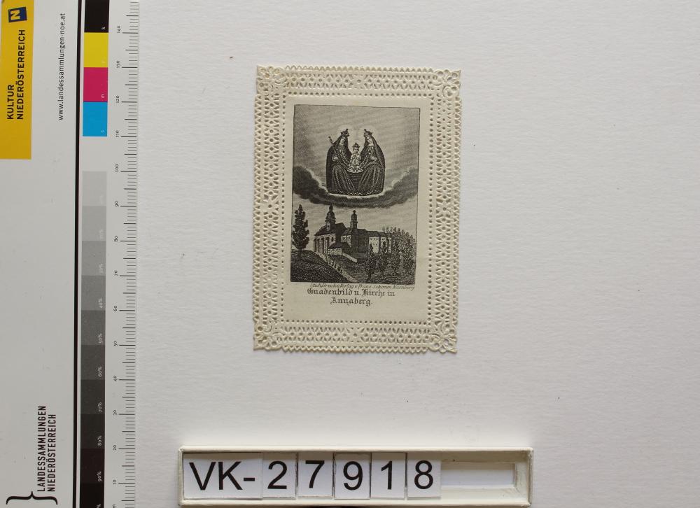 Annarotte, Annaberg, St. Anna Wallfahrtskirche; Vorderseite: Gnadenstatue = Anna Selbtritt = Anna Maria Jesus, Wallfahrtskirche, "Gnadenbild u. Kirche in Annaberg", "Stich, Druck u. Verlag v. Franz Schemm Nürnberg"; Rückseite: "Gebet"