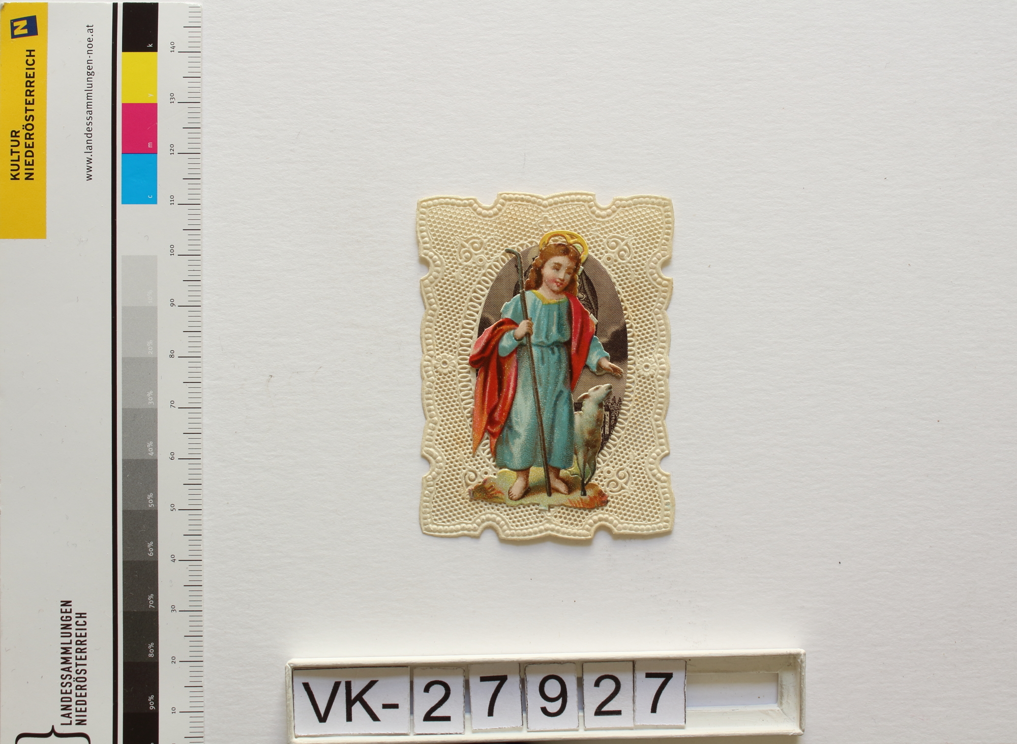 Annarotte, Annaberg, St. Anna Wallfahrtskirche; Vorderseite: Jesus mit Wanderstock und Lamm = zum Wegklappen; Gnadenstatue = Anna Selbtritt = Anna Maria Jesus, Wallfahrtskirche; Rückseite: Gebet "Gnadenreiche Mutter Anna", "Andenken an Annaberg", handschriftlich "N 3" und "6 x", "Verlag von Franz Schemm Nürnberg"
