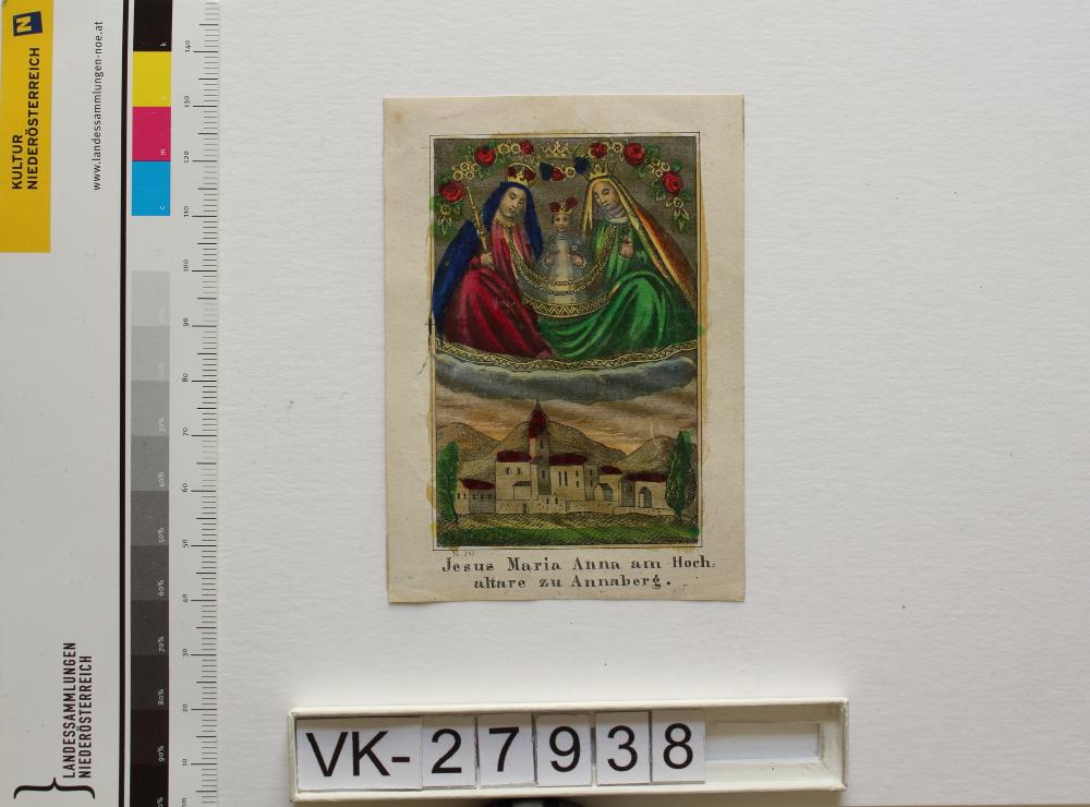 Annarotte, Annaberg, St. Anna Wallfahrtskirche; Vorderseite: Gnadenstatue = Anna Selbtritt = Anna Maria Jesus, Wallfahrtskirche, Blumen (Rosen, Stiefmütterchen?), "Jesus Maria Anna am Hochaltare zu Annaberg", "N 243"; Rückseite: handschriftlich "9000 K/ xxx (unleserlich)