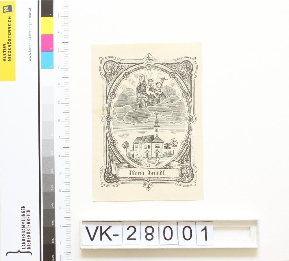 Poysdorf, Maria Bründl; Vorderseite: Gnadenbild = Maria mit Kind und Johannesknaben, Wallfahrtskirche, "Maria Bründl"; Rückseite: "Zum Andenken/ aus wahrer Freundschaft/ Vom Gnadenort bin ich gekommen und habe Dieses mitgenommen"