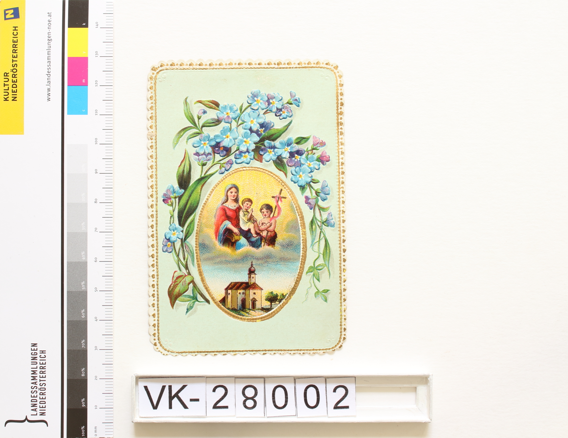 Poysdorf, Maria Bründl; Vorderseite: Gnadenbild = Maria mit Kind und Johannesknaben, Wallfahrtskirche, Blumen (Vergissmeinnicht); Rückseite: Gebet "Gnadenreiche Mutter Jesu", "Zum frommen Andenken"