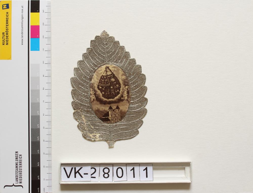 Schottwien, "Maria Schutz" im Semmeringgebiet; Vorderseite: Gnadenbild = Maria mit Kind, Wallfahrtskirche; Rückseite: "Gebet", "Franz Schemm Nürnberg", monogrammiert "FW"; Bildchen in Form eines Blattes