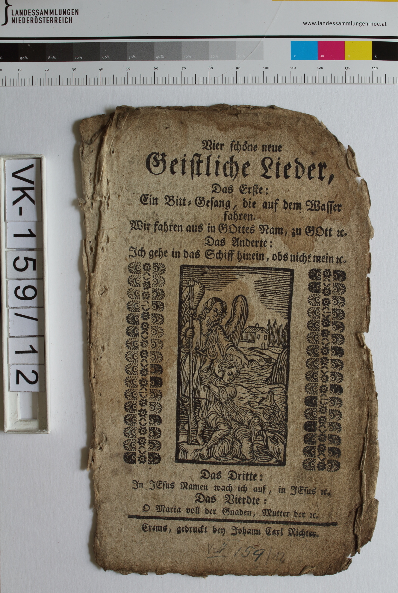 Geistliche Lieder; 2 Blatt, gefaltet, ursprüngleich geheftet: "Vier schöne neue Geistl. Lieder, Das Erste: Ein Bitt=Gesang, die auf dem Wasser fahren. Wir fahren aus in Gottes Namen, zu Gott ec./ Das Anderte: "Ich gehe in das Schiff hinein obs nicht mein ec./ Das Dritte: In Jesus Nahmen wach ich auf, in Jesu ec./ Das Vierte: O Maria voll der Gnaden, Mutter der ec.", "Krembs, gedruckt bey Johann Carl Richter", Abbildung: Kind, Schutzengel; Eintrag Inventarbuch: "18 geistliche Lieder (in einem Umschlag)
