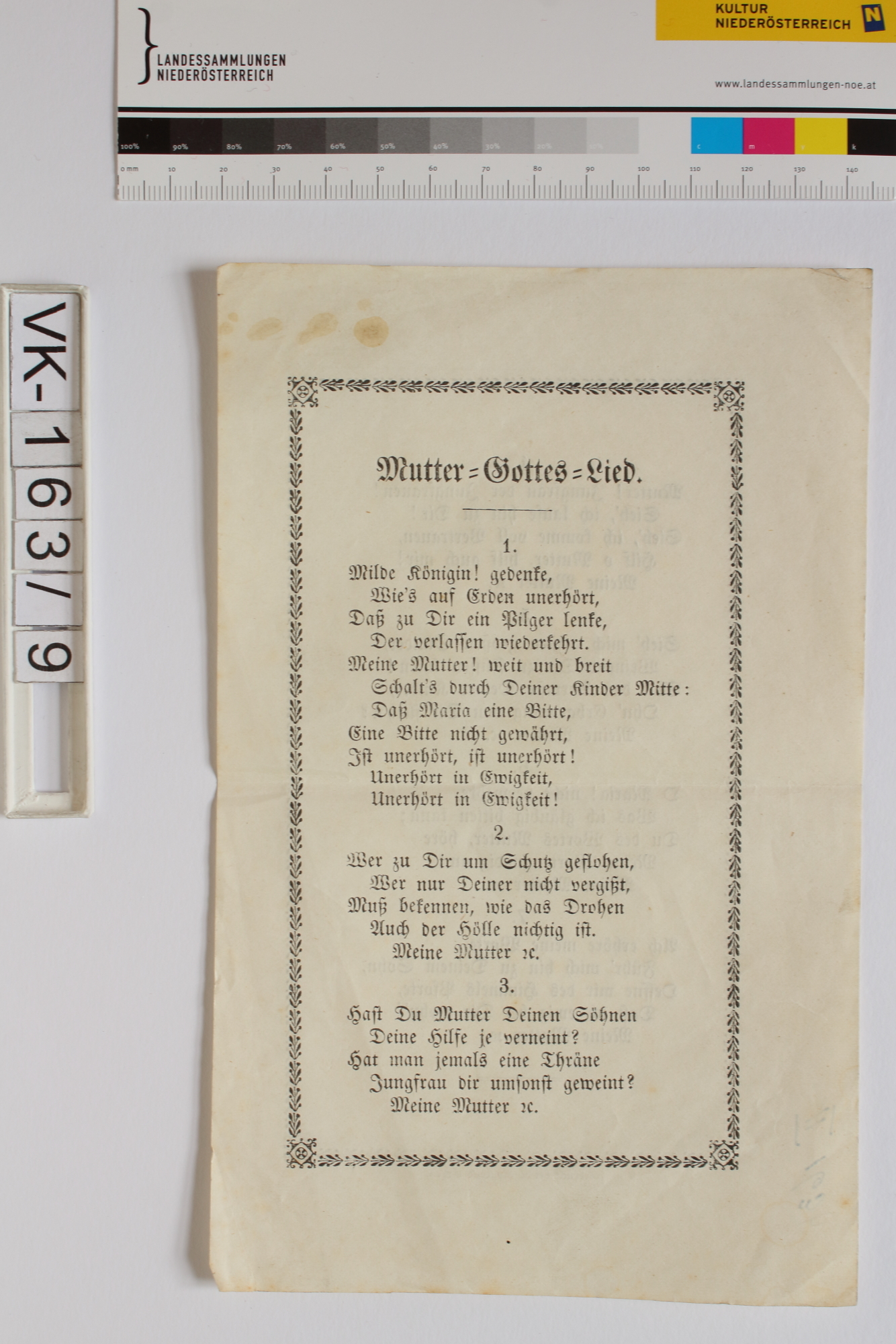 Marienlieder; 1 Blatt: "Mutter=Gottes=Lied", "Gedruckt bei R. Rohrer´s Erben"; Eintrag Inventarbuch: "Marienlieder"