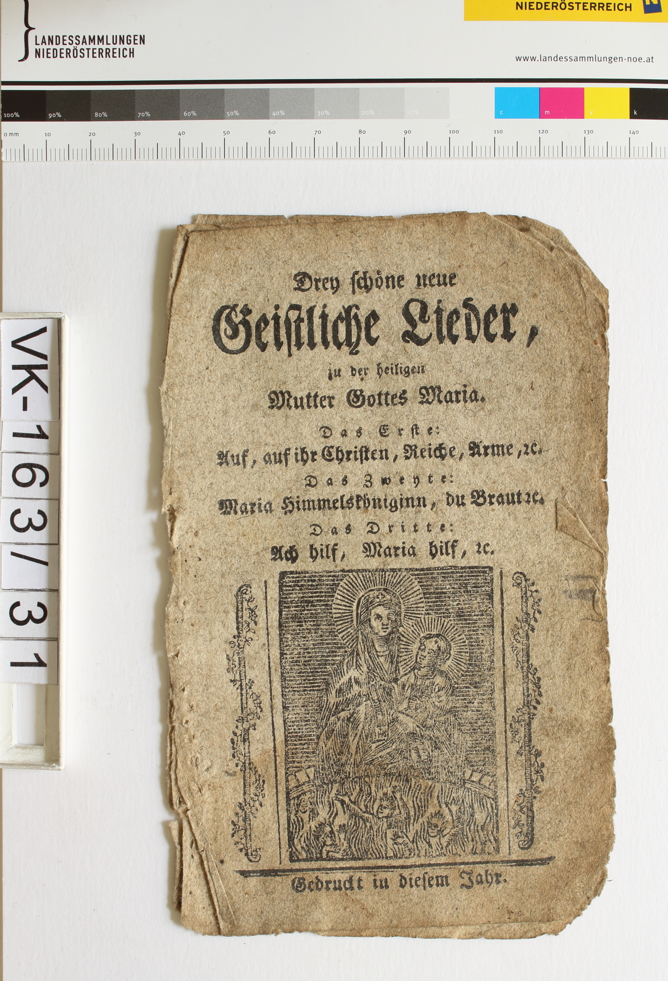 Marienlieder; 4 Blatt, lose, ursprünglich geheftet: "Drey schöne neue Geistliche Lieder zu der heiligen Mutter Gottes Maria. Das Erste: Auf, auf ihr Christen, Reiche, Arme, ec./ Das Zweyte: Maria Himmelskönigin, du Braut ec./ Das Dritte: Ach hilf, Maria hilf, ec.", "gedruckt in diesem Jahr", Abbildung: Maria mit Kind, Fegefeuer; Eintrag Inventarbuch: "Marienlieder"