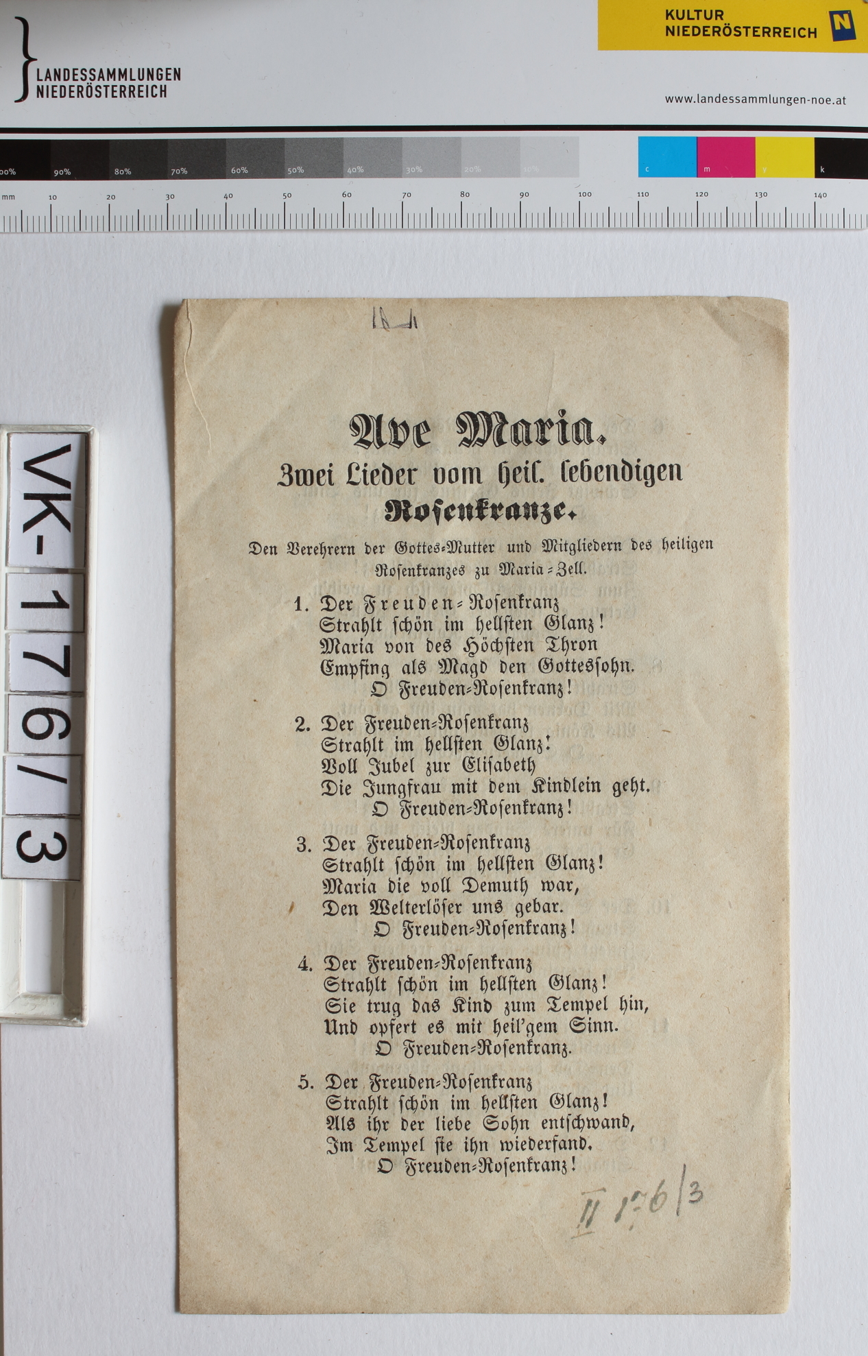 Mariazeller Wallfahrtslieder; 1 Blatt, gefaltet: "Ave Maria. Zwei Lieder vom heil. Lebendigen Rosenkranze. Den Verehrern der Gottes=Mutter und Mitgliedern des heiligen Rosenkranzes zu Maria=Zell", "W.D."; Eintrag Inventarbuch: "Mariazeller Wallfahrtslieder; Wallfahrtsmuseum Kleinmariazell III/2-588/22m-1974, Galler 3.4.1974, ab 1983 Mödling"