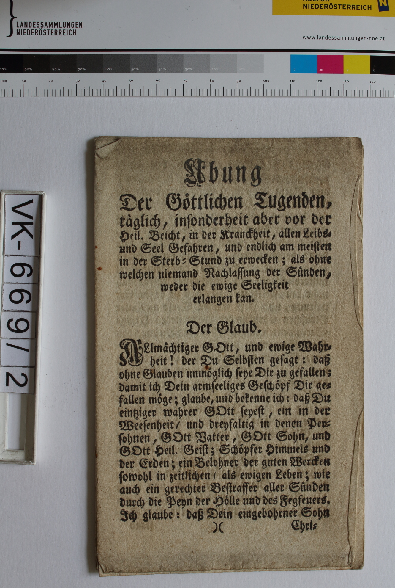 Haupttugenden; 3 Blatt, gefaltet: "Übung der Göttlichen Tugenden", "Der Glaub./ Die Hoffnung./Die Lieb./ Reu und Leyd mit steiffen Fürsatz./ Schluß=Gebett"; Eintrag Inventarbuch: "Gebete: 3 Haupttugenden"