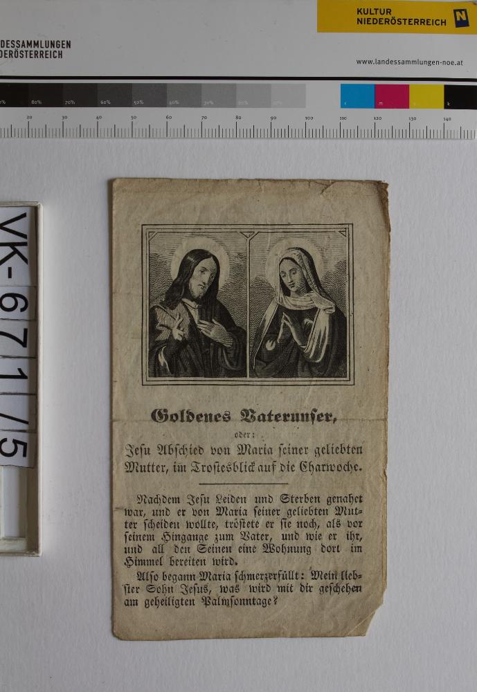 Goldenes Vaterunser; 1 Blatt, gefaltet: "Goldenes Vaterunser, oder: Jesu Abschied von Maria seiner geliebten Mutter, im Trostesblick auf die Charwoche", Abbildung: Jesus, Maria, "Prag bei Jos. Rudl./ Druck bei M J. Landau"; Eintrag Inventarbuch: "Goldenes Vaterunser"