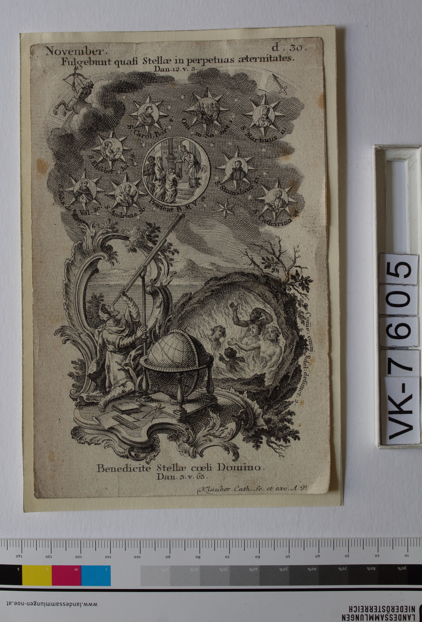 Natur/- Monatszettel; 1 Blatt, Vorderseite: Kalenderblatt "November/ Fulgebunt quasi Stellae in perpetuas aeternitates", Abbildung: Heilige, biblische Szenen; Eintrag Inventarbuch: "Kalenderblatt November, Slg. Lotte Sterzer, Abt. III/2-406/1m-1968"; verklebt auf Karton