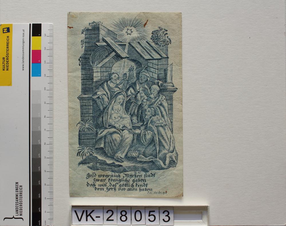 Anbetung der Hl. 3 Könige; Vorderseite: Maria, Jesus, Josef, Kasper, Melchior, Balthasar, Stall, "Gold Weyrauch Myrhen sindt zwar königliche gaben/ doch will das göttliche kindt dem hertz vor allen haben ", "Au..Str..ger (unleserlich)"; Rückseite: monogrammiert "FW"