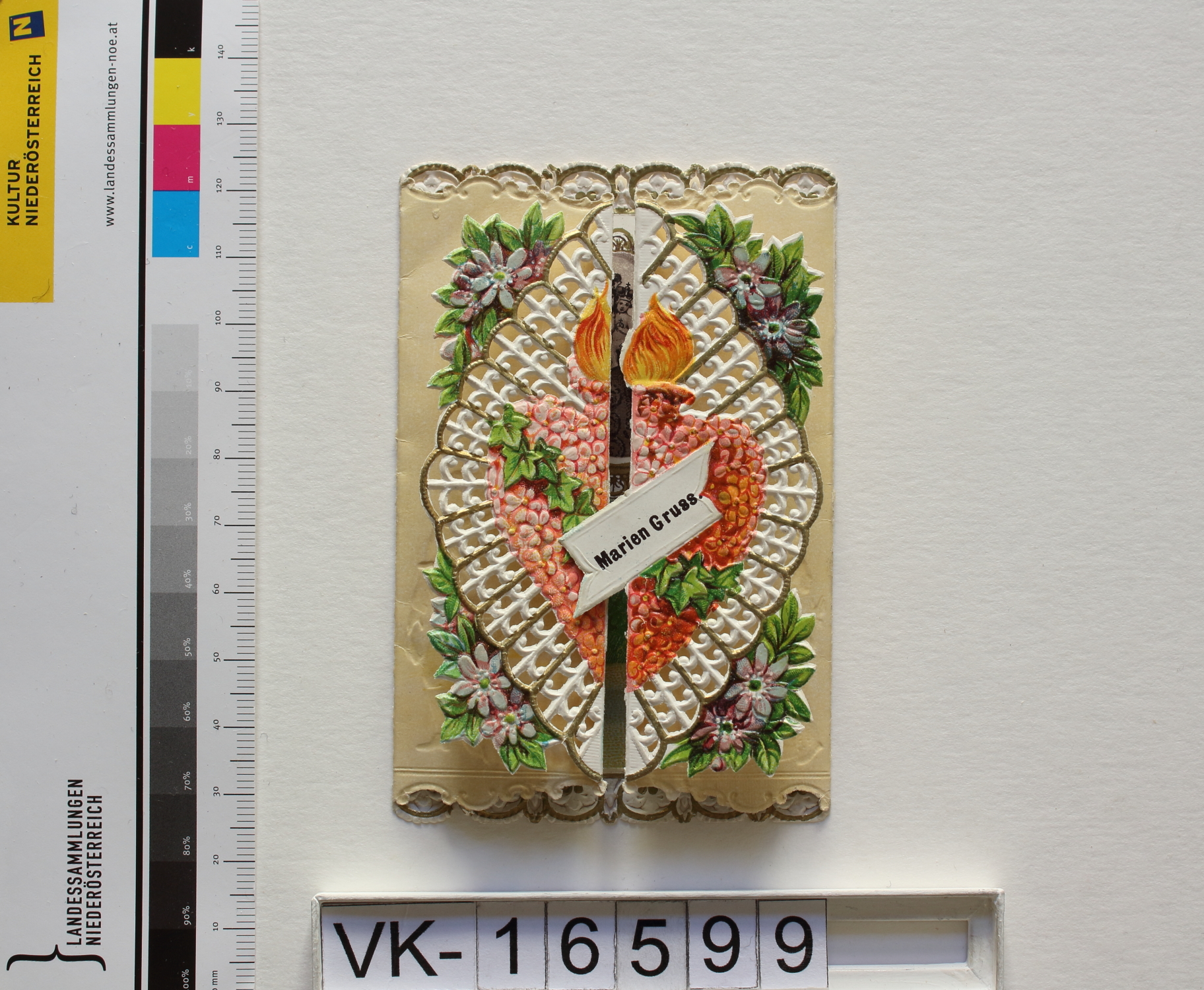 Hl. Maria; aufklappbar: Vorderseite: Flammenherz aus Blüten und Weinlaub; Blumen, "Marien Gruss"; Innenseiten: Gnadenstatue = Maria mit Kind, von jungen Mädchen getragen; Wallfahrer, Gebet; Rückseite: Gebet "O Maria, Preis sei Dir!"