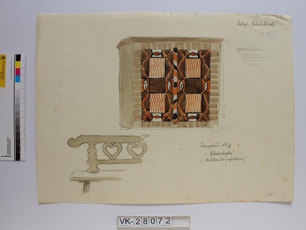 Zeichnung aus der Serie Waldviertler Heimatbilder: "Ortsgruppe Schönbach, Lengau Nr. 4 "Schönhofer" (Ortsbauernführer); HZN"; signiert; 1/25, 5; Teilansicht: Bank, Kasten bemalt, Skizze Kastensims