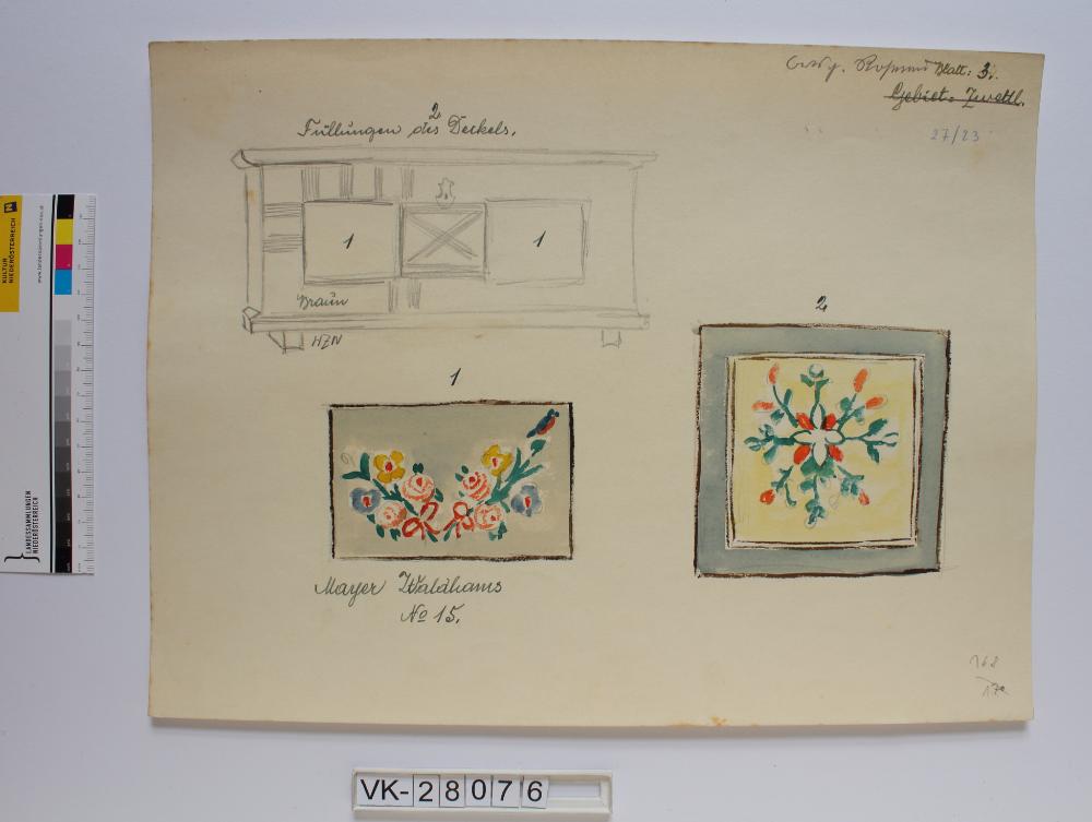 Zeichnung aus der Serie Waldviertler Heimatbilder: "Blatt 3: Gebiet Zwettl (Ortsgr. Rosmann), Mayer Waldhams Nr. 15, Füllungen des Deckels; HZN"; signiert; 27/23, 168; Skizze: Truhe; Bemalung der Füllungen Vorderansicht und Deckel: Blumen