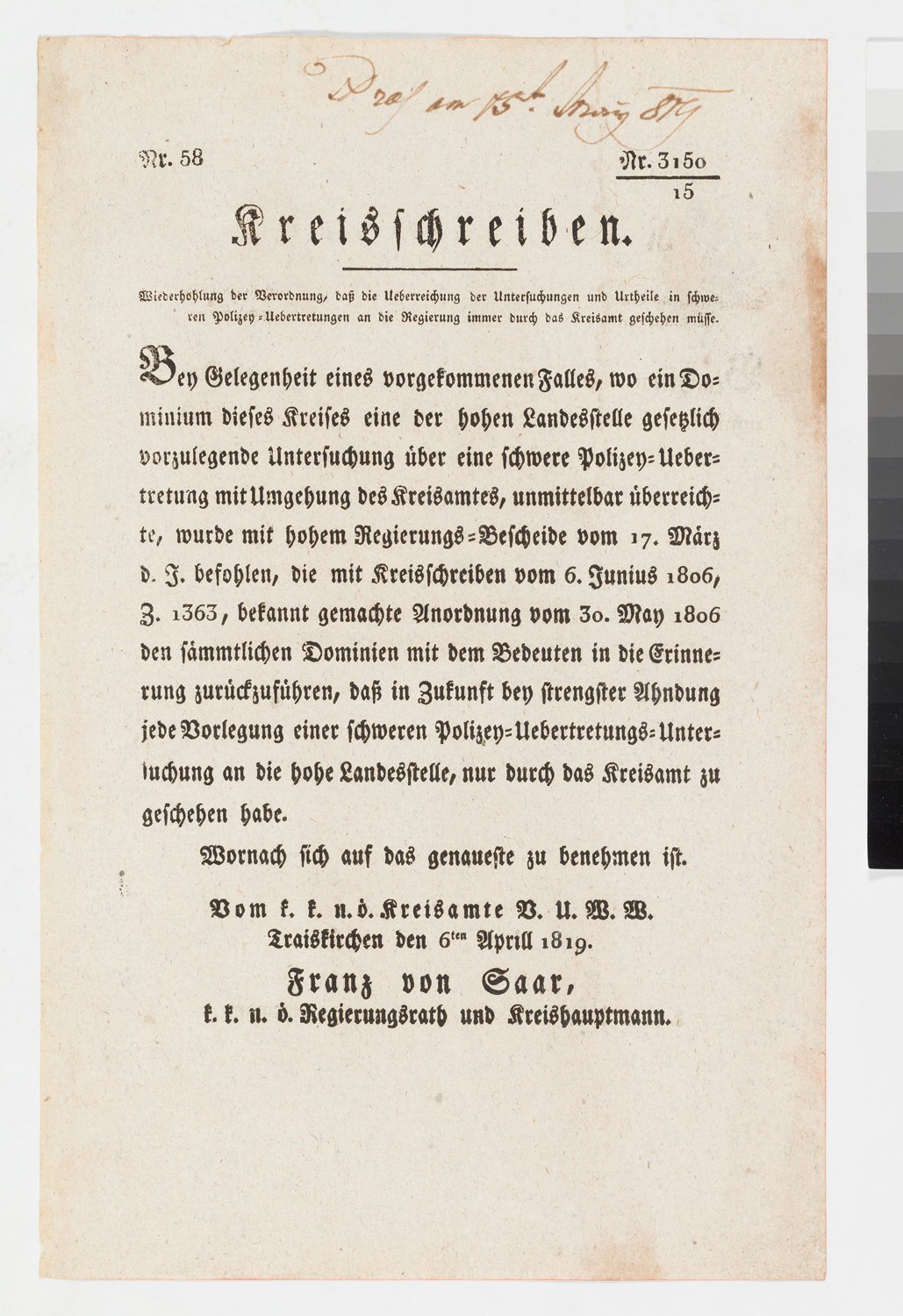 "Kreisschreiben. Wiederholung der Verordnung, daß die Ueberreichung der Untersuchungen und Urtheile in schweren Polizey-Uebertretungen an die Regierung immer duch das Kreisamt geschehen müsse. [...] Vom k.k. n.ö. Kreisamte V.U.W.W. Traiskirchen den 6ten April 1819. Franz von Saar, k.k. n.ö. Regierungsrath und Kreishauptmann."