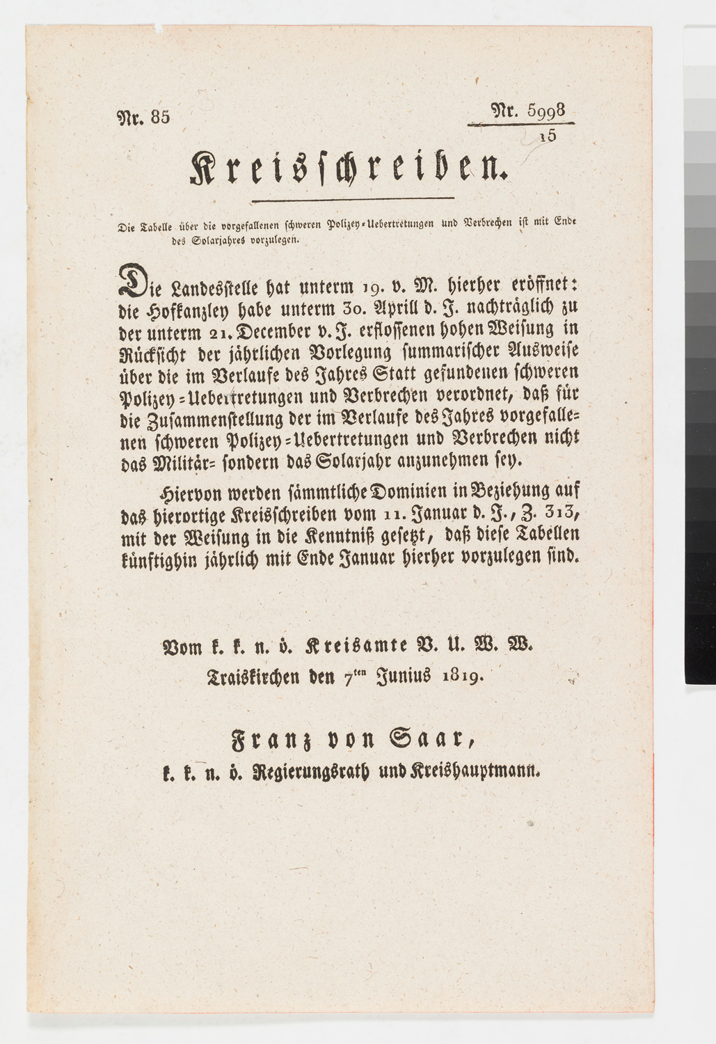 "Kreisschreiben. Die Tabelle über die vorgefallenen schweren Polizey=Uebertretungen und Verbrechen ist mit Ende des Solarjahres vorzulegen. [...] Vom k.k. n.ö. Kreisamte V.U.W.W. Traiskirchen den 7ten Junius 1819. Franz von Saar, k.k. n.ö. Regierungsrath und Kreishauptmann."