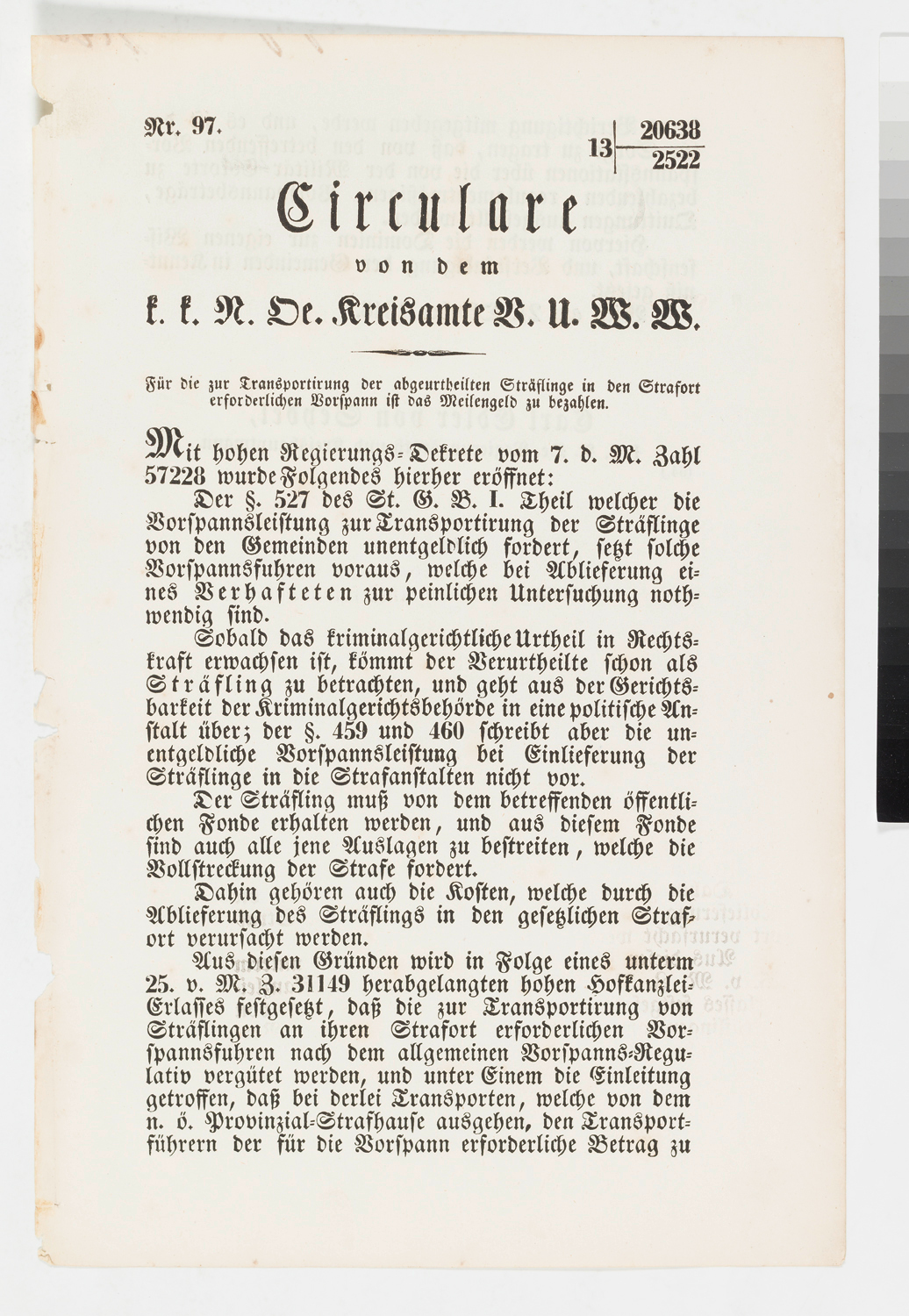 "Circulare von dem k.k. N. Oe. Kreisamte V.U.W.W. Für die Transportirung der abgeurtheilten Sträflinge in den Strafort erforderlichen Vorspann ist das Meilengeld zu bezahlen. [...] Wien am 21. Oktober 1846. Carl Edler von Seydel, k.k. N. Oe. Regierungsrath und Kreishauptmann."