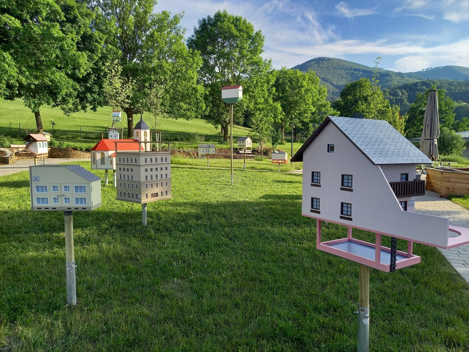 Das Pflege- und Betreuungszentrum Hainfeld hat in der gerade fertiggestellten Gartenanlage eine kleine neue Gemeinde erhalten. 20 ungewöhnliche Miniaturen von real existierenden Wohnhäusern der Bewohner*innen des Zentrums sind zukünftig eine Bereicherung auf vielen Ebenen. Sie sind Orte der Erinnerung, spielerische Triebfeder für Dialog und Austausch gleichermaßen für alle dort lebenden und arbeitenden Menschen wie für Besucher*innen. Sie sind aber auch Futter- und Nistplätze für eine ganze Reihe heimischer Vogelarten, die den Garten beleben werden.