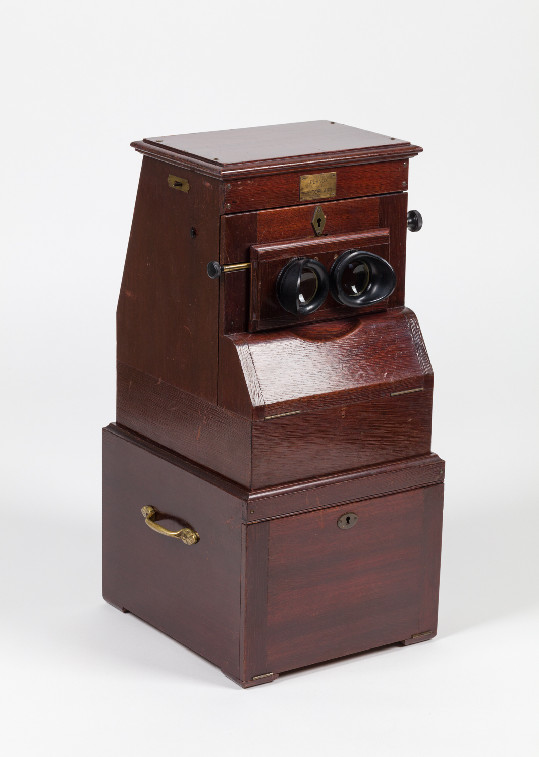 Tischstereoskop mit automatischer Weiterschaltung zur Betrachtung von 20 Glasplattenstereofotografien pro Durchlauf. Zweiteiliger Mahagonikasten mit Beschlägen und Schieber mit axial drehbarer Arretierung aus teilweise lackiertem Messing zum Weiterschalten der Ansichten und zur Anzeige der jeweiligen Ansicht. auf der linken Seite ein Kippschalter zur Änderung der Bildformate (6-13, 45-107). Im separaten unteren Bereich Kasten mit frontaler Klappe mit Schloss zwei Schubladen zur Aufnahme von sechs Magazinen aus Bakelit. Das Planox-Heidoplast Stereoskop war ein deutsch-französisches Gemeinschaftsprojekt der Firmen Planox in Frankreich, welche die Gehäuse lieferte, die optische Technik entstand in Deutschland bei Franke & Heidecke, welche unter dem Markennamen Rollei auftrat.