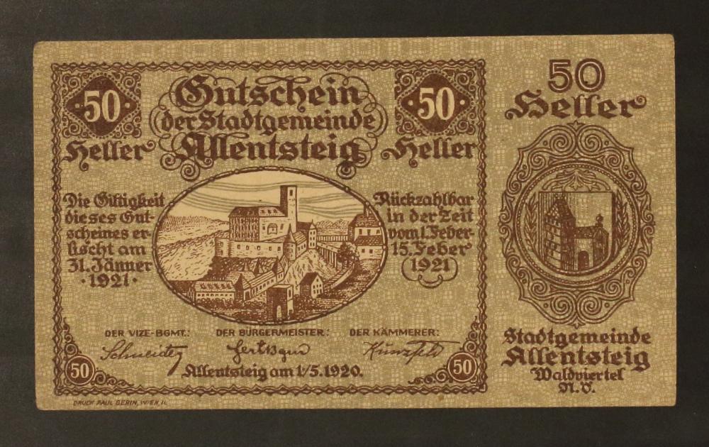 Stadtgemeinde Allentsteig Gutscheine zu 50 Heller, Abb. Stadtwappen und Stadtansicht, Faksimile Unterschrift des Bürgermeisters Allentsteig.