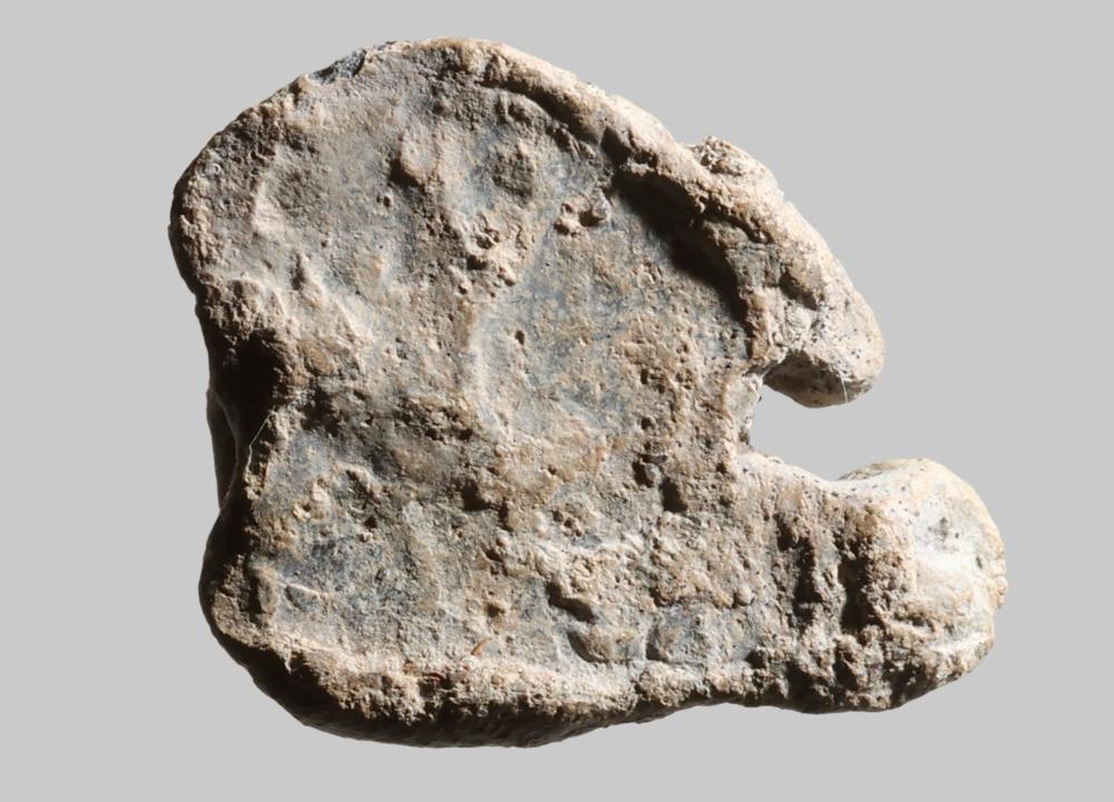 Unförmige Plombe mit seitlichen Zipfeln und rundem Stempel. Darstellung kaum erkennbar, im unteren Bereich Mischwesen, vermutlich ein Hippokampus oder Capricorn, im Profil nach links. Auf ihm eine Figur sitzend und vor sich einen runden Gegenstand haltend. Rückseite zwei paralle konvexe Linien entlang der seitlichen Ränder verlaufend. Doppelte waagrechte Durchlochung durch zwei Schnurführungen.