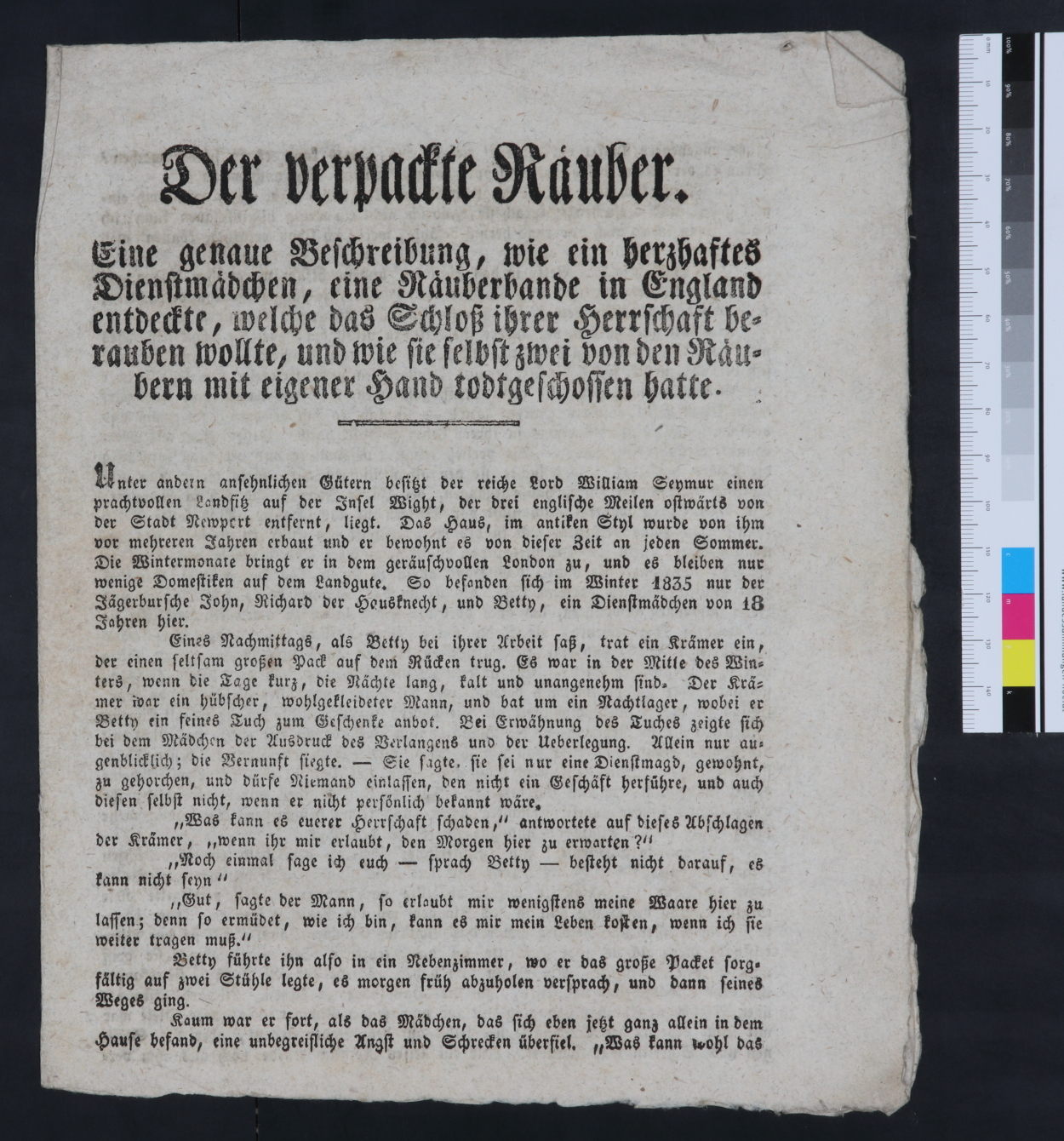 „Der verpackte Raeuber. Eine genaue Beschreibung, wie ein herzhaftes Dienstmaedchen, eine Raeuberbande in England entdeckte, welche das Schloß ihrer Herrschaft berauben wollte, und wie sie selbst zwei von den Raeubern mit eigener Hand todtgeschossen hatte.“