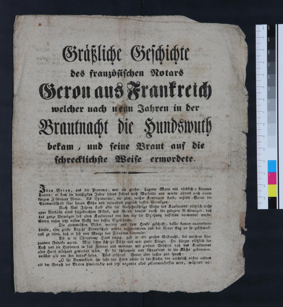 „Graeßliche Geschichte des französischen Notars Geron aus Frankreich welcher nach neun Jahren in der Brautnacht die Hundswuth bekam, und seine Braut auf die schrecklichste Weise ermordete.“