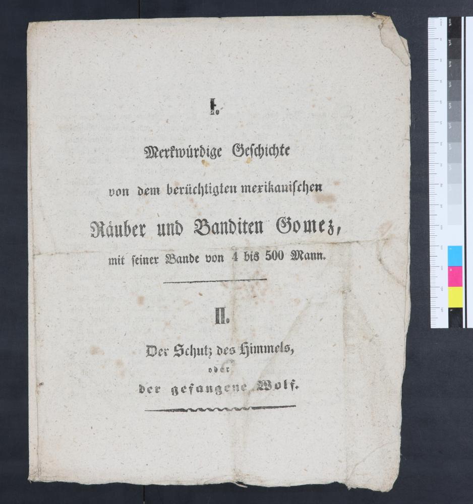 „I. Merkwuerdige Geschichte von dem berüchtigten mexikanischen Raeuber und Banditen Gomez, mit seiner Bande von 4 bis 500 Mann. / II. Der Schutz des Himmels, oder der gefangene Wolf.“