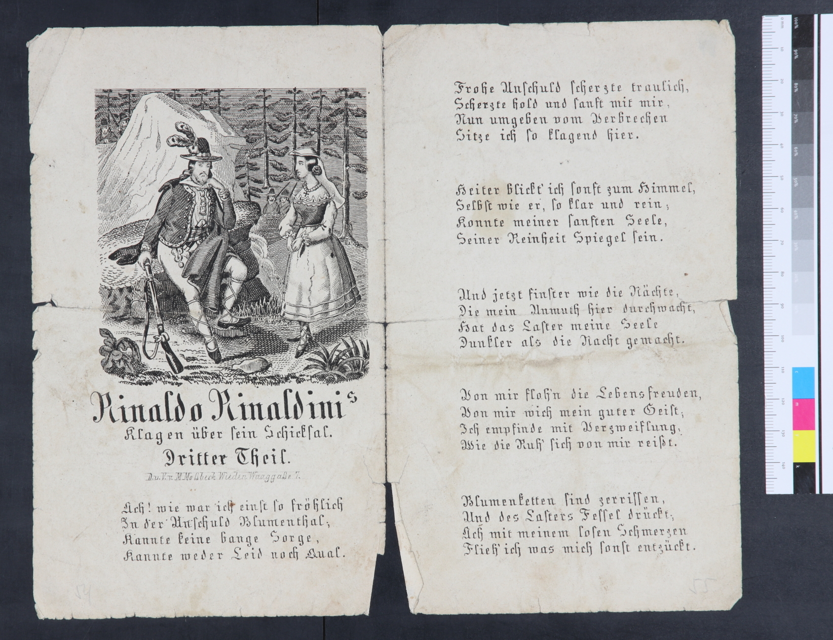 Vierseitiges Heft; 1. und 4. Seite unbedruckt; 2. Seite eigentlicher Titel und halbseitige Graphik des Räubers mit Flinte und Braut; 2. und 3. Seite 6strophiges Lied.
