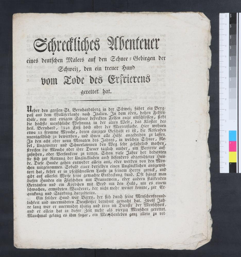 „Schreckliches Abenteuer eines deutschen Malers auf den Schnee = Gebirgen der Schweiz, den ein treuer Hund vom Tode des Erfrierens gerettet hat.“