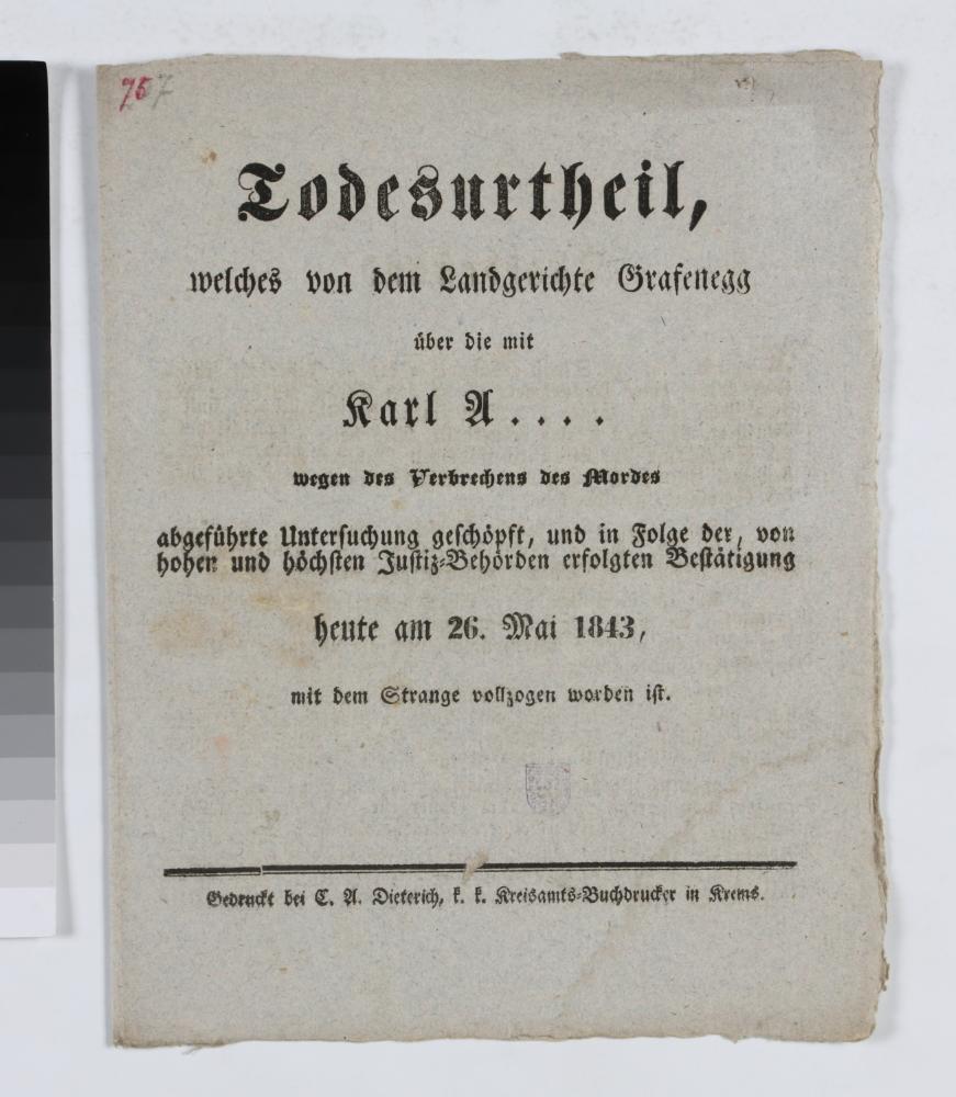 „Todesurtheil, welches von dem Landgerichte Grafenegg über die mit Karl A**** wegen des Verbrechens des Mordes abgeführte Untersuchung geschöpft, und in Folge der, von hohen und höchsten Justiz=Behörden erfolgten Bestätigung heute am 26. Mai 1843, mit dem Strange vollzogen worden ist.“