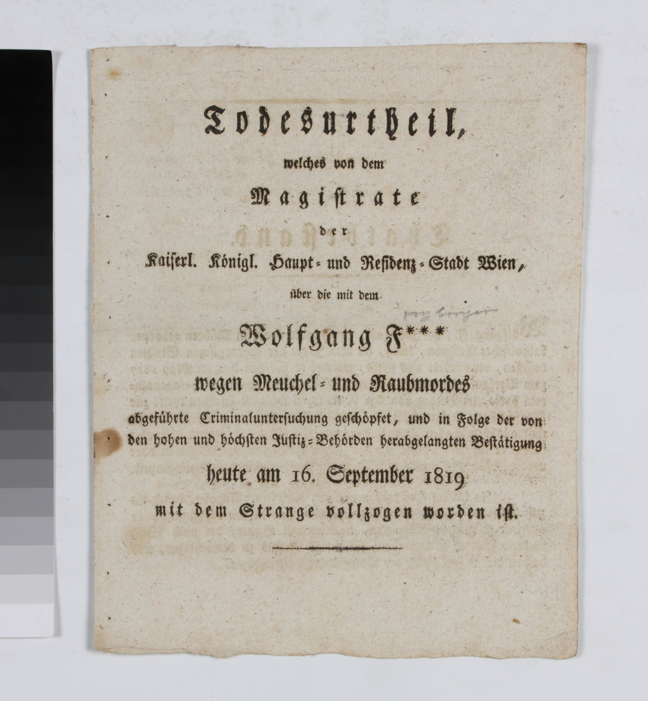 „Todesurtheil, welches von dem Magistrate der Kaiserl. Königl. Haupt= und Residenz=Stadt Wien, über die mit dem Wolfgang Freyberger wegen Meuchel= und Raubmordes abgeführte Criminaluntersuchung geschöpfet, und in Folge der von den hohen und höchsten Justiz=Behörden herabgelangten Bestätigung heute am 16. September 1819 mit dem Strange vollzogen worden ist.“