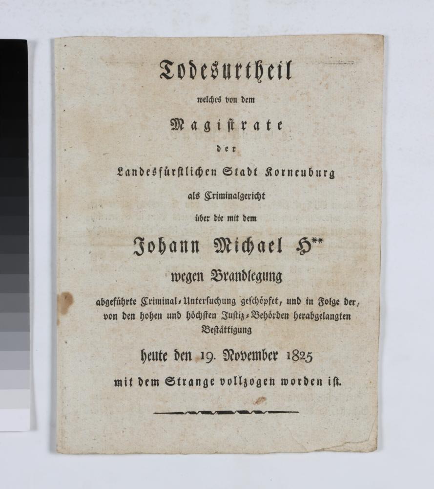 „Todesurtheil welches von dem Magistrate der Landesfürstlichen Stadt Korneuburg als Criminalgericht über die mit dem Johann Michael H** wegen Brandlegung abgeführte Criminal=Untersuchung geschöpfet, und in Folge der, von den hohen und höchsten Justiz=Behörden herabgelangten Bestättigung heute den 19. November 1825 mit dem Strange vollzogen worden ist.“
