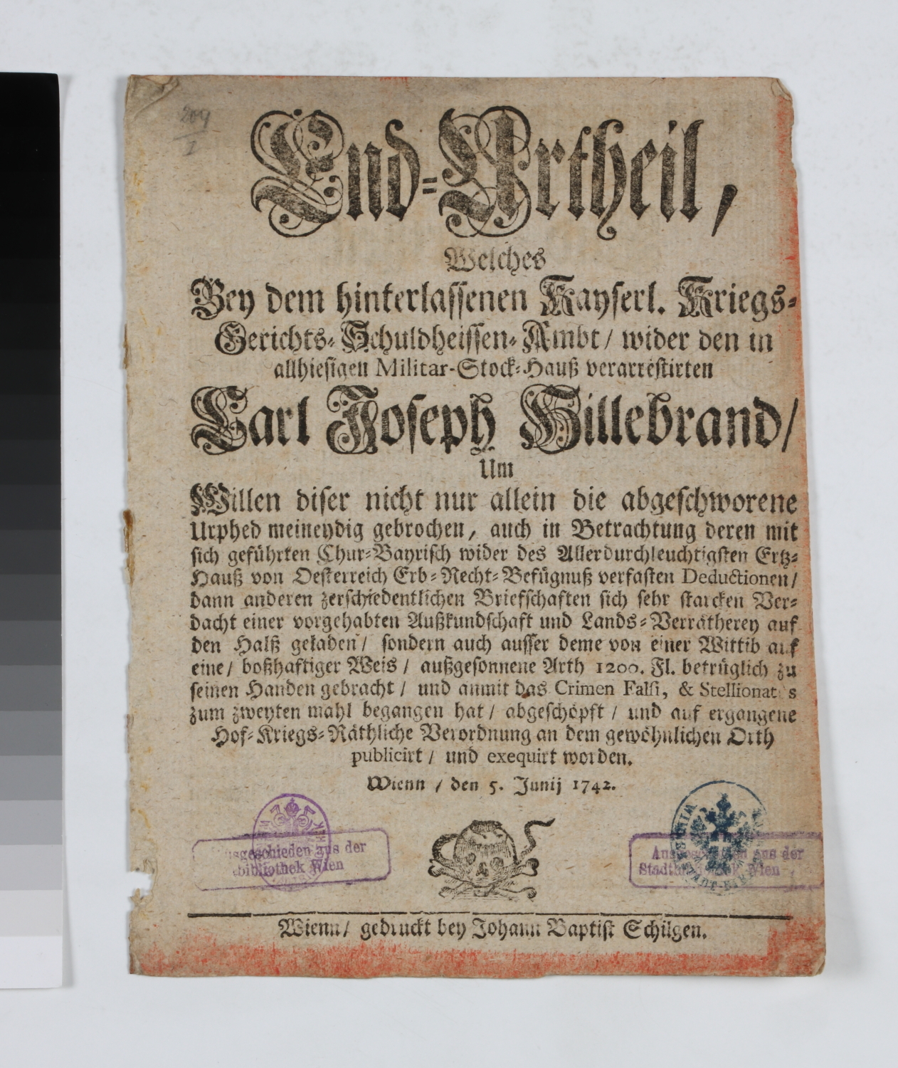 „End=Urtheil, Welches Bey dem hinterlassenen Kayserl. Kriegs=Gerichts=Schuldheissen=Ambt / wider den in allhiesigen Mitlitar-Stock=Hauß verarrestirten Karl Joseph Hillebrand / Um Willen diser nicht nur allein die abgeschworene Urphed meineidig gebrochen, auch in Betrachtung deren mit sich geführten Chur=Bayrisch wider des Allerdurchleuchtigsten Ertz=Hauß von Oesterreich Erb=Recht=Verfügnuß verfasten Deductionen / dann anderen zerschiedentlichen Briefschaften sich sehr starcken Verdacht einer vorgehabten Außkundschaft und Lands=Verrätherey auf den Halß geladen / sondern auch ausser deme von einer Wittib auf eine / boßhaftiger Weis / außgesonnene Arth 1200. Fl. betrüglich zu seinen Handen gebracht / und anmit das Crimen Falfi, & Stellionatus zum zweyten mahl begangen hat / abgeschöpft / und auf ergangene Hof=Kriegs=Räthliche Verordnung an dem gewöhnlichen Orth pzblicirt / und exequirt worden. Wienn / den 5. Junij 1742.“ „Es solle Hillebrand wegen seines erst=besagten des falschen und Betrügerey verübten Verbrechen durch den Profosen auf die=vor dem Cärntner=Thor befindliche Militar-Richtstatt geführet / allda durch den Stockmeister dem Freymann übergeben / und mit dem Strang vom Leben zum Todt hingerichtet werden.“
