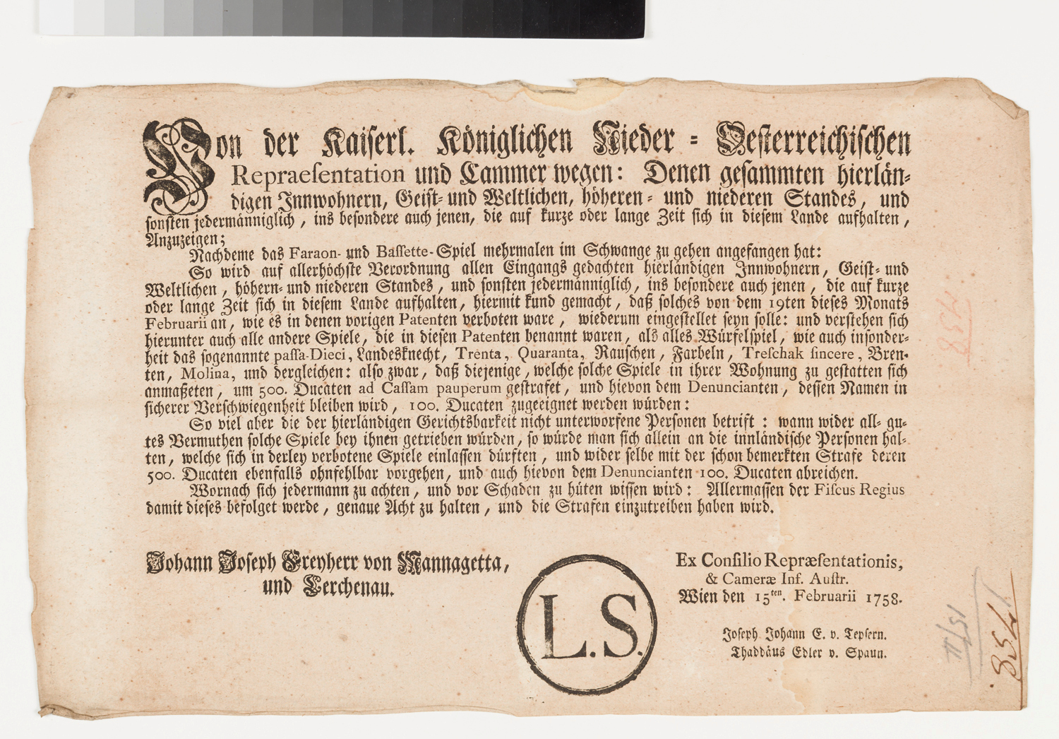 Die kaiserlich und königliche niederösterreichische Repräsentation und Kammer verbietet das Spielen von Pharaon, Bassette, Passa-Dieci, Landsknecht, Trenta, Quaranta, Raushen, Farbeln, Treschak fincere, Brenten, Molina und dergleichen und stellt diese unter Strafe