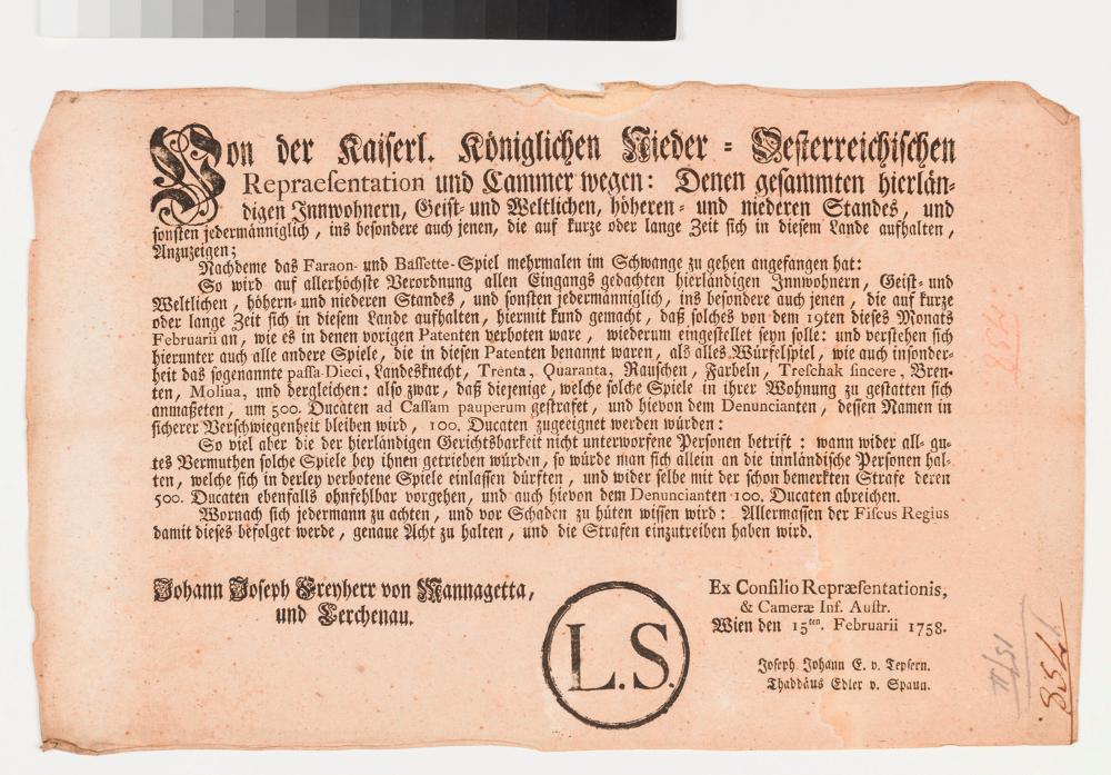 Die kaiserlich und königliche niederösterreichische Repräsentation und Kammer verbietet das Spielen von Pharaon, Bassette, Passa-Dieci, Landsknecht, Trenta, Quaranta, Raushen, Farbeln, Treschak fincere, Brenten, Molina und dergleichen und stellt diese unter Strafe