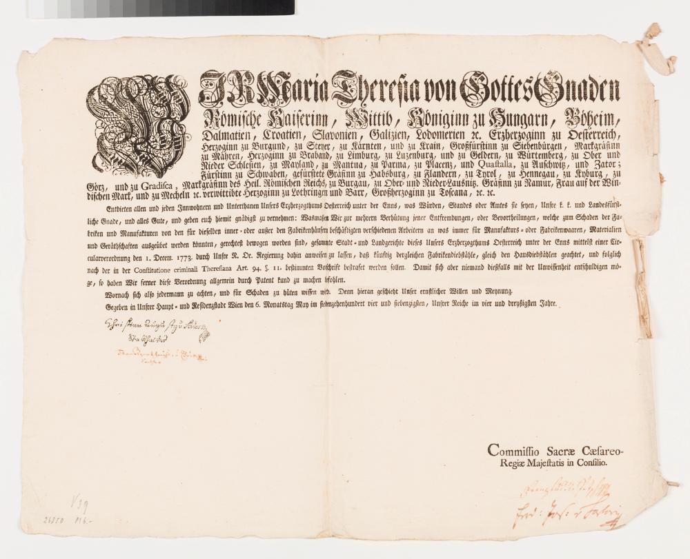 Maria Theresia verkündet die Gleichsetzung der Fabriksdiebstähle mit den Hausdiebstählen und deren Sanktionierung durch die Constitutio Criminalis Theresiana Art. 94 § 11 im Erzherzogtum Österreich unter der Enns
