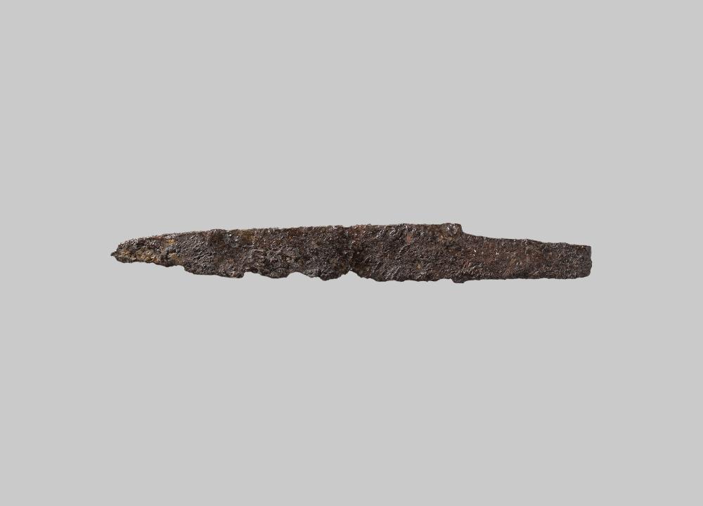 Messer mit fragmentiertem, breitem, flachem, mittelständigem Griff und gebogenem Rücken. Die abgesetzte Klinge und Spitze sind abgebrochen.