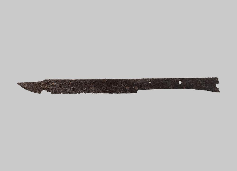 Messer mit fragmentierter, geschweifter Klinge mit zwei halbmondförmigen Punzen und abgebrochenem Griff mit zwei Nietlöchern in der einseitigen Leiste.