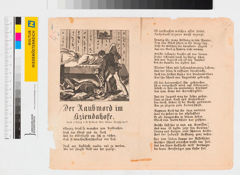 Bänkellied mit halbseitigem Druck der Tat (Kupferstich), zehn Strophen, einseitiger Druck.