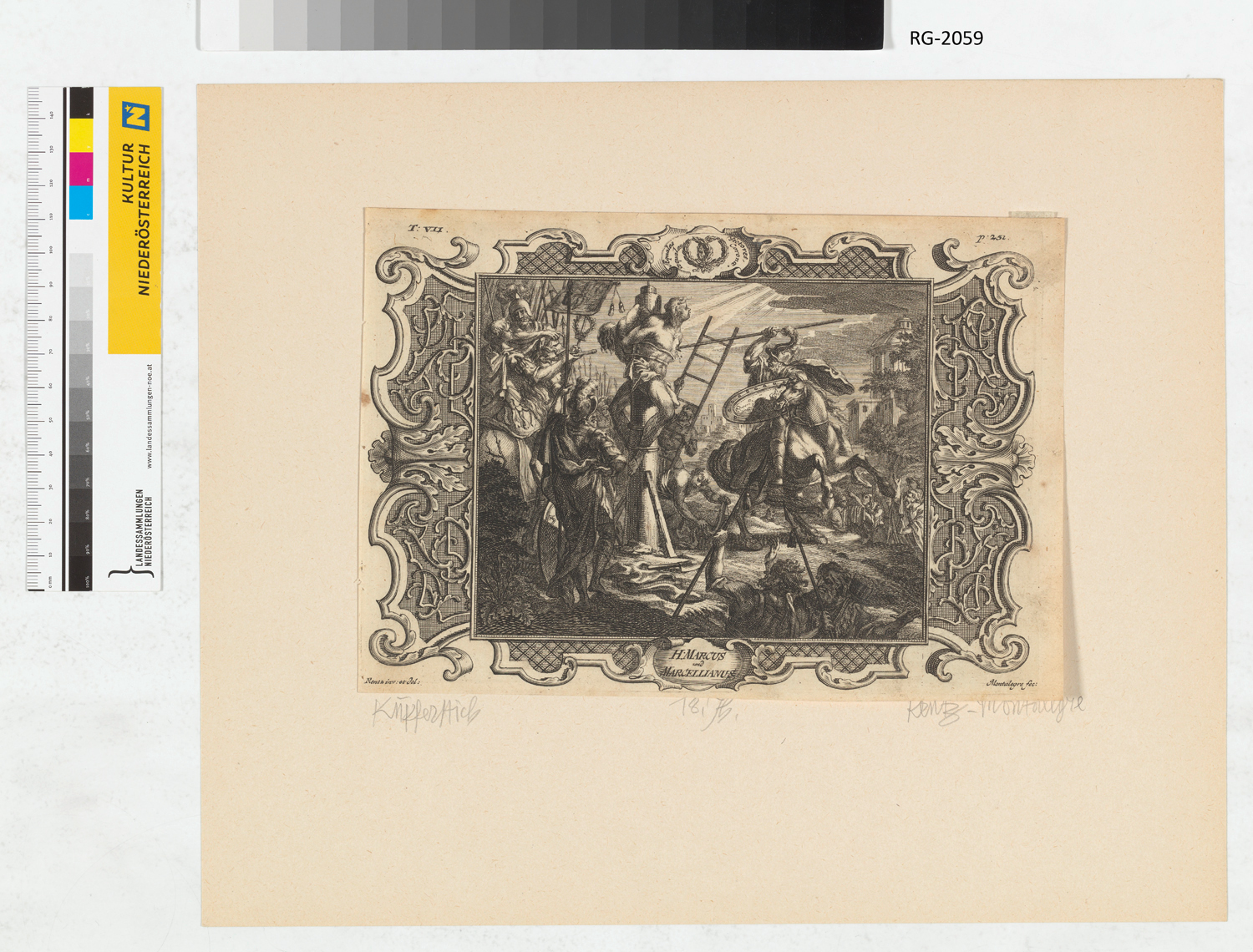 Kupferstich aus: "Geistreiche Gesänge und Lieder auf Alle Sonntags-Evangelien und Episteln So in dem christlichen Jahre enthalten seyn : 7 : Geistreiche Gesänge und Lieder Uber Sonn- gemeine Ferial- und Fest-Tags-Episteln und Evangelia, welche In dem VII. Theile Des Christlichen Jahres Von der Verkündigung der Allerseeligsten Jungfrauen Biß auff Die Heimsuchung Mariä Begrieffen sind"