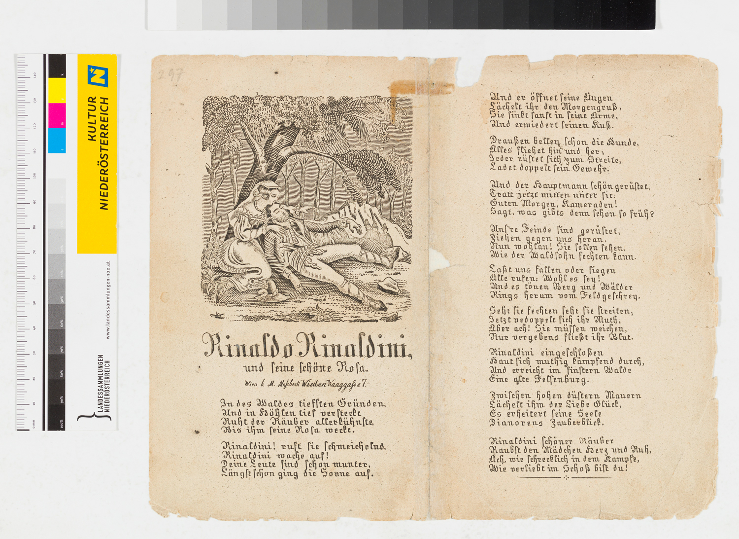 Bänkellied mit halbseitigem Druck des Rinaldo Rinaldini und seiner Rosa (Kupferstich), elf Strophen, einseitiger Druck.