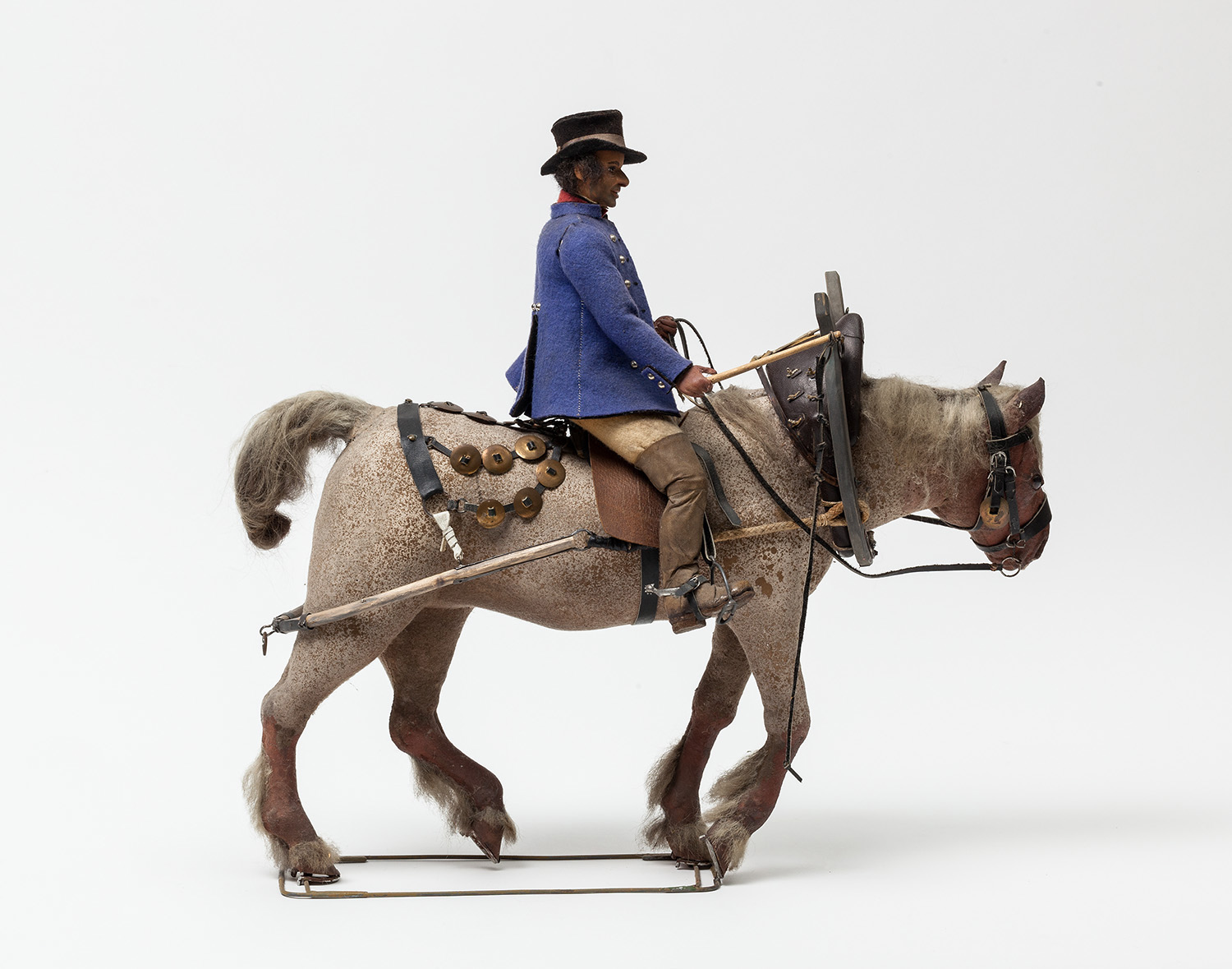 Reiter mit blauem Frack auf braun gesprenkelten Pferd