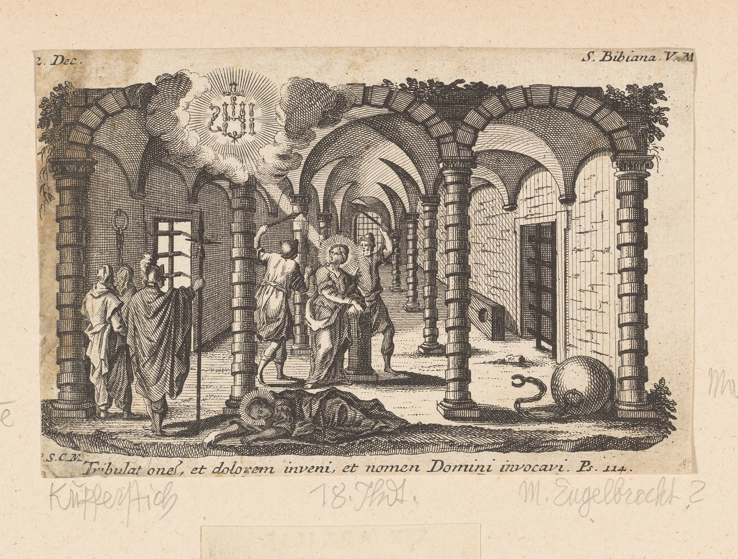 Martyrium der heiligen Bibiana - daneben zu sehen ein Fußblock und eine Steinkugel mit Kette.