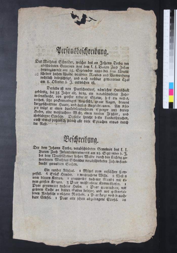 "Personenbeschreibung. Des Mathias Schneider, welcher des an Johann Torba verabschiedeten Gemeinen von dem k.k. Baron Zach Infanterieregimente am 25. September 1820 bei dem Neutitscheiner hohen Walde verübten Raubes und Verwundung rechtlich beinzichtigt, und nach ruchbar gewordener That am 8. Oktober l. J. entwichen ist. [...] K.K. Kreiskriminalgericht zu Neutitschein den 25. Oktober 1820. Karl Rösler, Kriminalrath. Joseph Adalbert Czapla, Kriminalgerichtsaktuar."