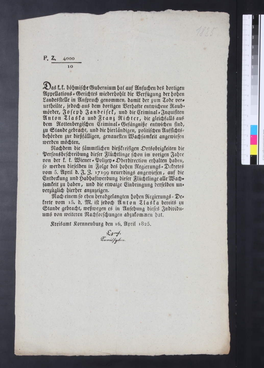 "Das k.k. böhmische Gubernium hat auf Ansuchen des dortigen Appellations=Gerichtes wiederhohlt die Verfügung der hohen Landestelle in Anspruch genommen, damit der zum Tode verurtheilte, jedoch aus dem dortigen Verhafte entwichene Raubmörder Joseph Jandeisek [...] Kreisamt Kornneuburg den 16. April 1825. Czech Kreishptm."