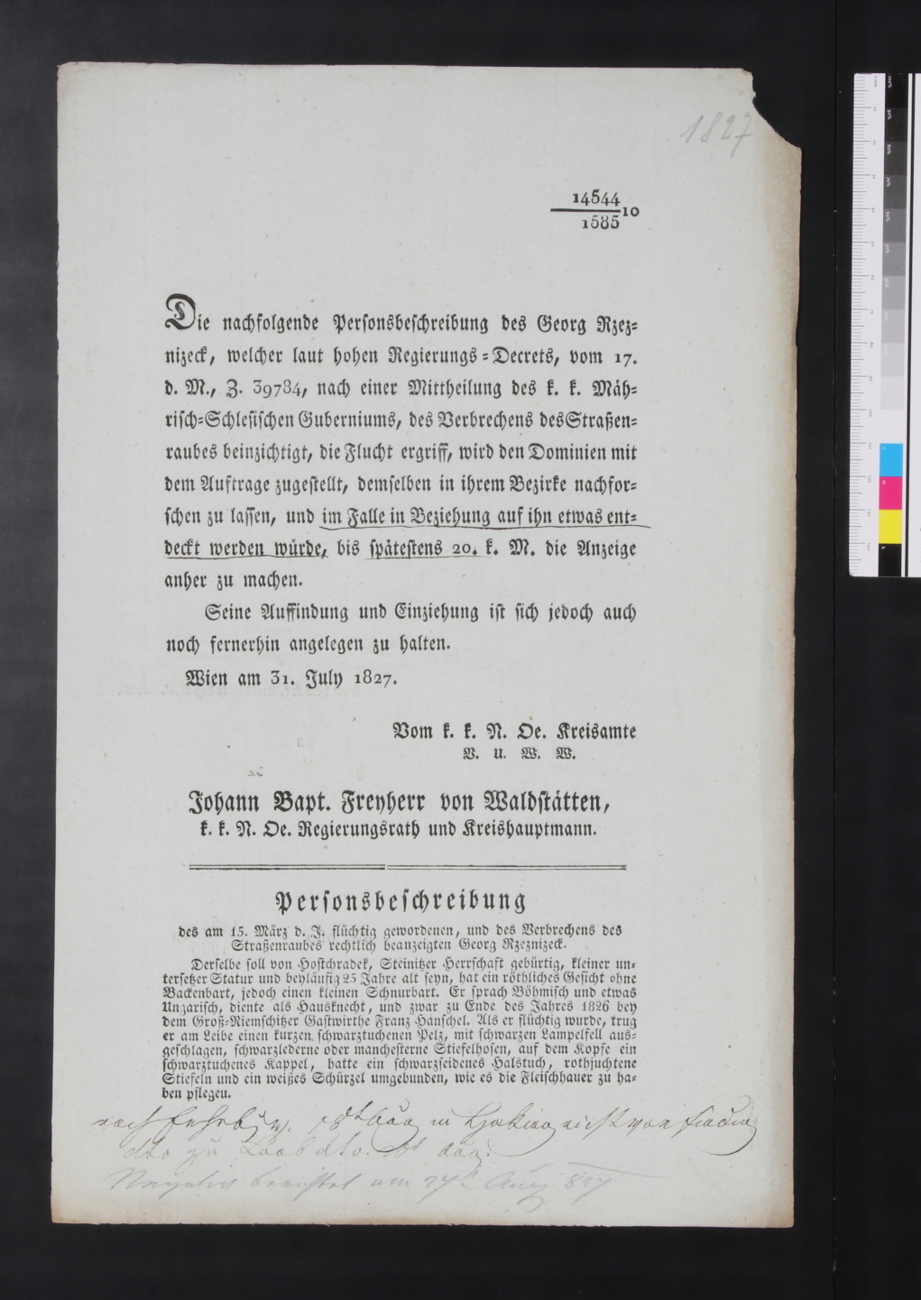 "Die nachfolgende Personbeschreibung des Georg Rzeznizeck, welcher laut hohen Regierungs=Decretes, vom 17. d. M., Z. 39784, nach einer Mittheilung des k.k. Mährisch=Schlesichen Guberniums, des Verbrechens des Straßenraubes beinzichtig, die Flucht ergriff [...] Wien am 31. July 1827. Vom k.k. N. Oe. Kreisamte V.U.W.W. Johann Bapt. Freyherr von Waldstätten, k.k. N. Oe. Regierungsrath und Kreishauptmann."
