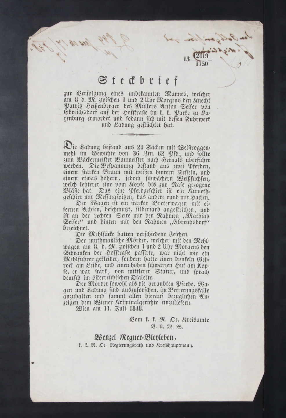 "Steckbrief zur Verfolgung eines unbekannten Mannes, welcher am 8. d. M. zwischen 1 und 2 Uhr Morgens den Knecht Patriz Heißenberger des Müllers Anton Seiser von Ebreichsdorf auf der Hofstraße im k.k. Parke zu Laxenburg ermordet und sodann sich mit dessen Furhwerk und Ladung geflüchtet hat [...] Wien am 11. Juli 1848. Vom k.k. N. Oe. Kreisamte V.U.W.W. Wenzel Regner=Bleyleben, k.k. N. Oe. Regierungsrath und Kreishauptmann."