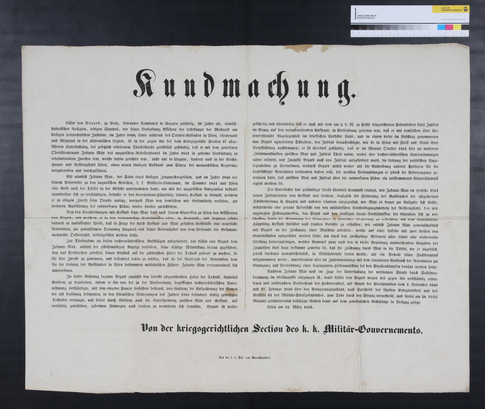 "Kundmachung. Cäsar von Bezard, Baranyer Comitates in Ungarn gebürtig, 26 Jahre alt, römisch-katholischer Religion, ledigen Standes, vor seiner Verhaftung Assistent der Lehrkanzel der Mechanik am hiesigen polytechnischen Institute, im Jahr 1848, sowie während des October=Aufruhrs in Wien, Lieutnant und Adjutant in der akademischen legion, [...] zum Todes durch den Strang verurtheilt, und dieses am 28. dieses Monats gerichtsherrlich bestätigte Urtheil heute auf dem gewöhnlichen Richtplatze in Vollzug gesetzt. Wien am 31. März 1853."