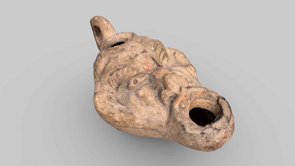 Eine Miniaturlämpchen mit einer Deckplatte in Form eines männlichen Kopfes (Satyr oder afrikanische Groteske), krauses Haar, große schräggestellte Augen, Falten auf Stirn und Wangen, übergroße Ohren, welche über das Lampenoval hinausragen. Die Augenbrauen sind mit plastischen Linien, Pupillen mit Punkten angedeutet. Kleine, runde Schnauze als Mund gebildet, welcher das Dochtloch umrahmt. Auf der Stirn ein von einem Ring umgebenes Eingußloch. Der Schnauze gegenüberliegend ein gelochter Scheibengriff mit einer Längsrille auf seinem Rücken. Schnauze durch Rille von Wandung getrennt. Die Wandung durch eine Rille von der Standplatte abgesetzt. Kleine Reste von Überzug.
